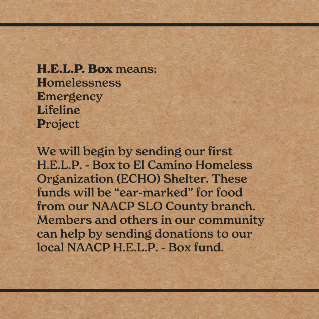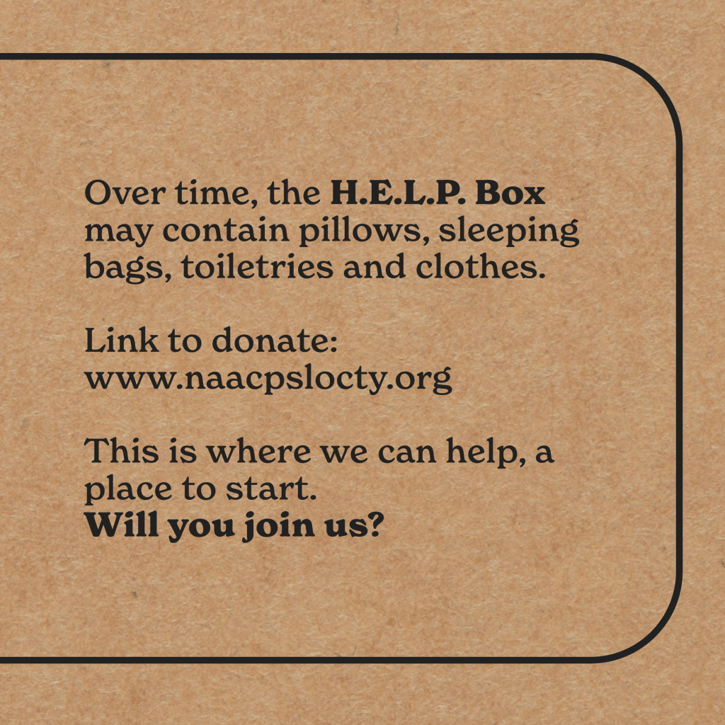 The NAACP has been involved in the fight for civil rights in the United States since 1909. I am honored to contribute to this organization in any way that I can. I have assisted with a poster for a rally as well as a graphic used on instagram to promote the H.E.L.P. box.